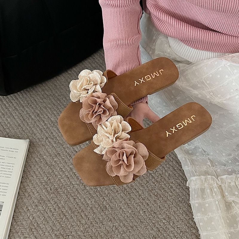 2025 Zomer Feeën Stijl Bloemen Platte Dames, Nieuw Koreaans, Grote Maat, Vierkante Kop, Eendelige Jurken, Fashion Hundred Slippers Casual Dagelijks