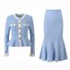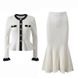 Frans geïnspireerde gebreide tweedelige set – elegante top met contrasterende kraag en maxi-rok met metallic accenten