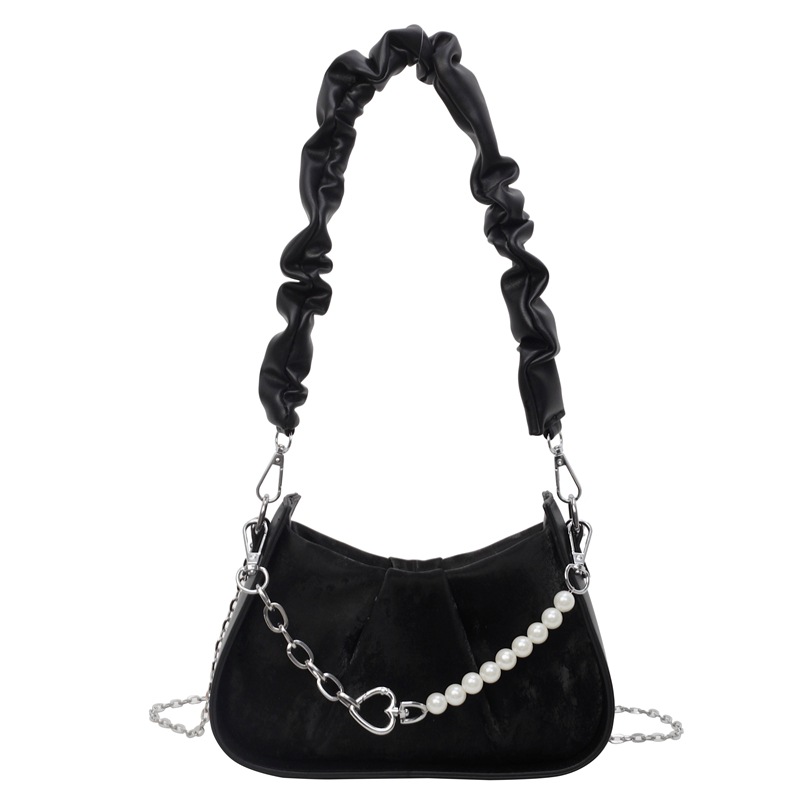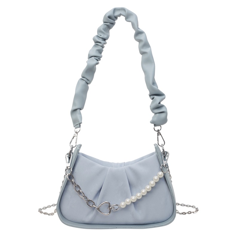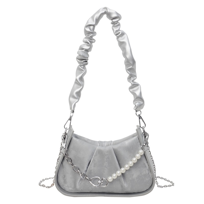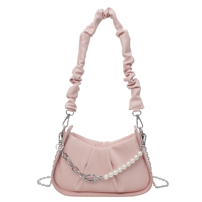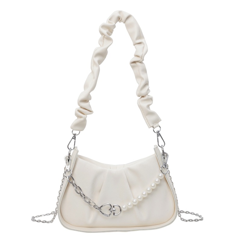 Fashionable women's bag with French niche design, new solid color, simple and stylish pearl chain, pleated and versatile crossbody bag