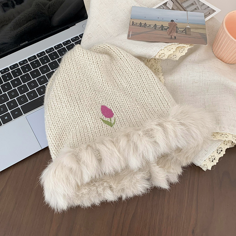 Tulip Rabbit Hair Fisherman Hat for Women in Autumn and Winter Korean Edition Warm Big Headband Knitted Woolen Hat White Plush Hat Trendy