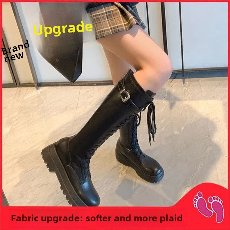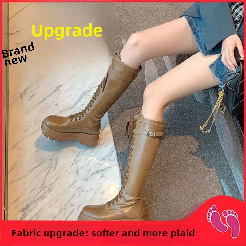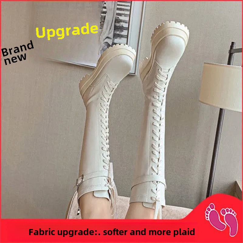 Reuzenbeen Lange knappe voorkant vetersluiting effen kleur ridderlaarzen dames nieuwe dikke zool maar knie afslankende lange laarzen hoge laarzen trendy