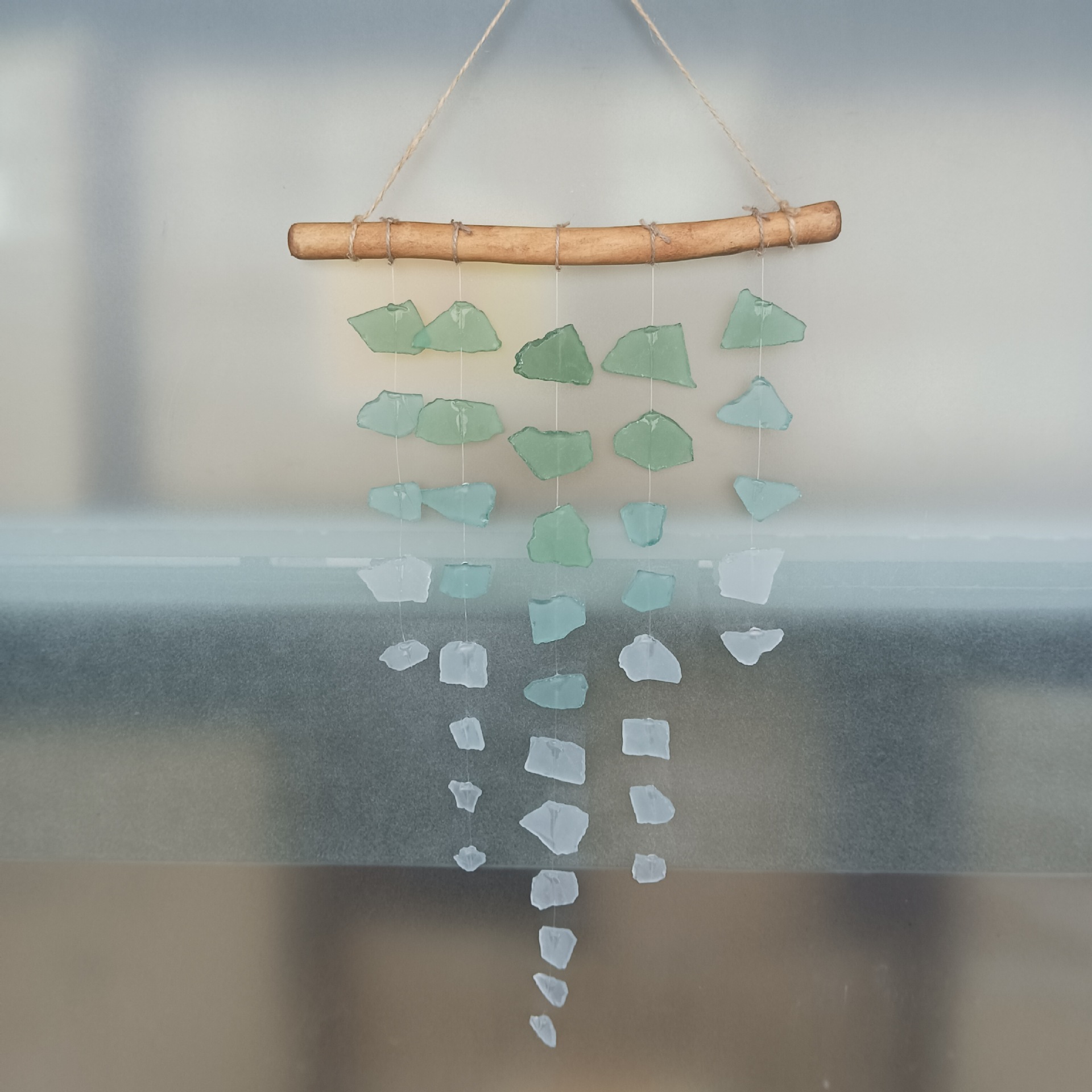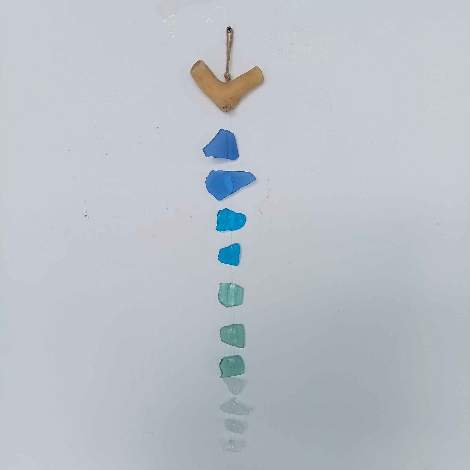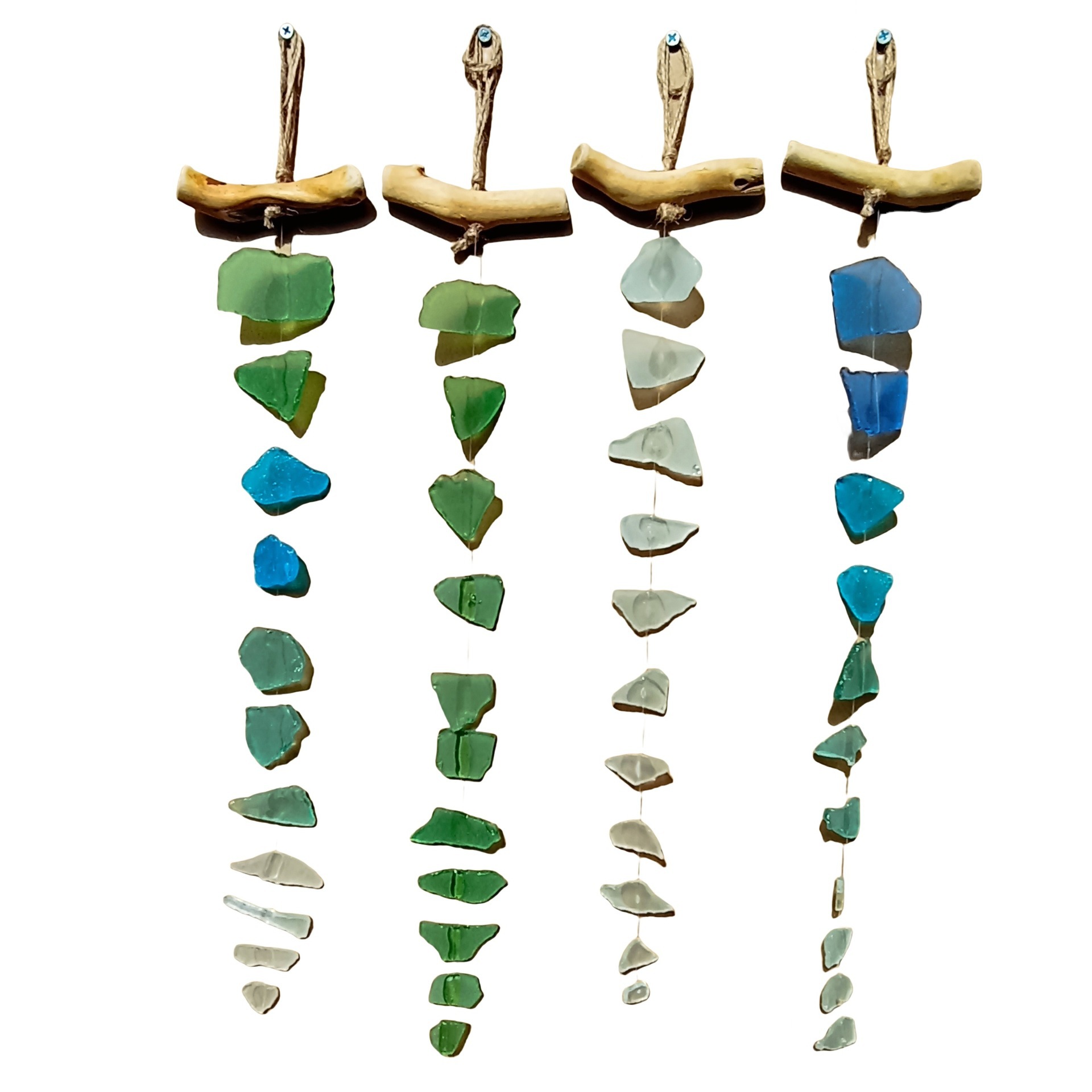 en drijfhout, gezandstraald Boheems zeeglas, handgemaakte windgong