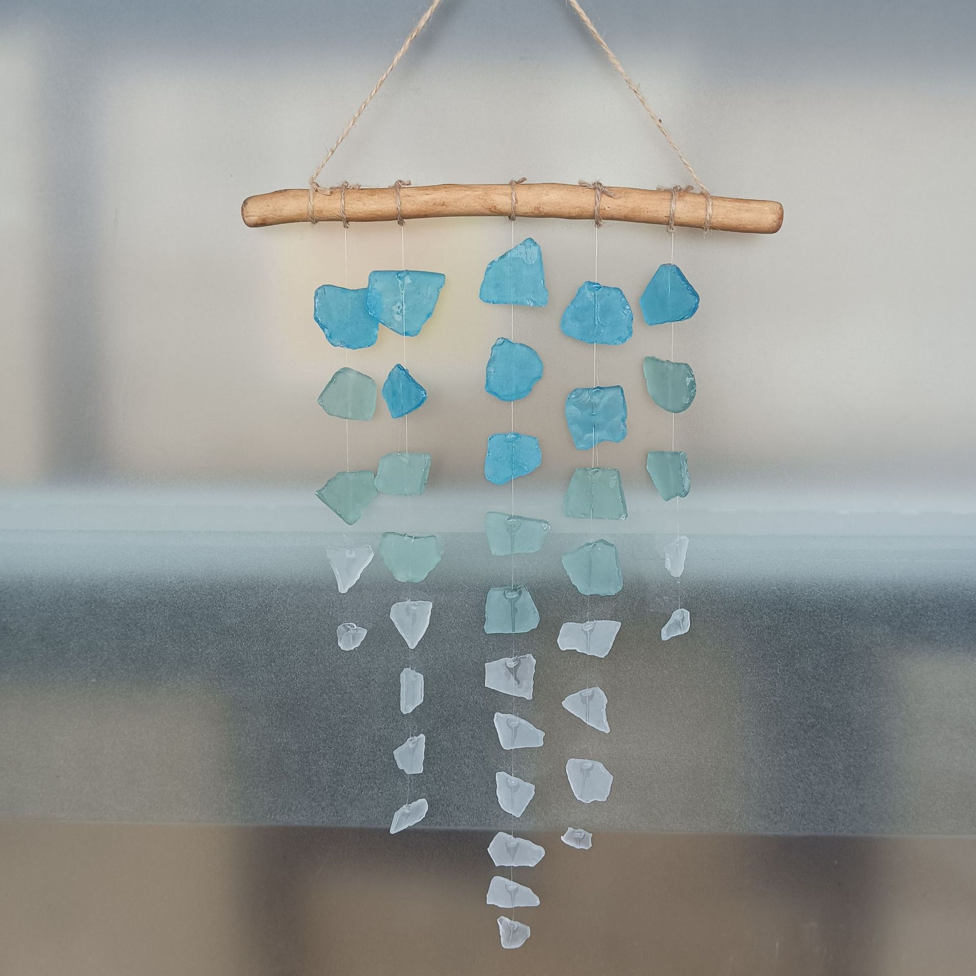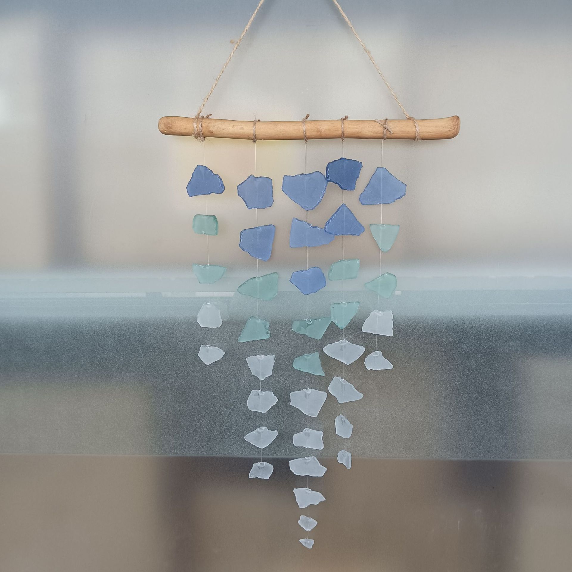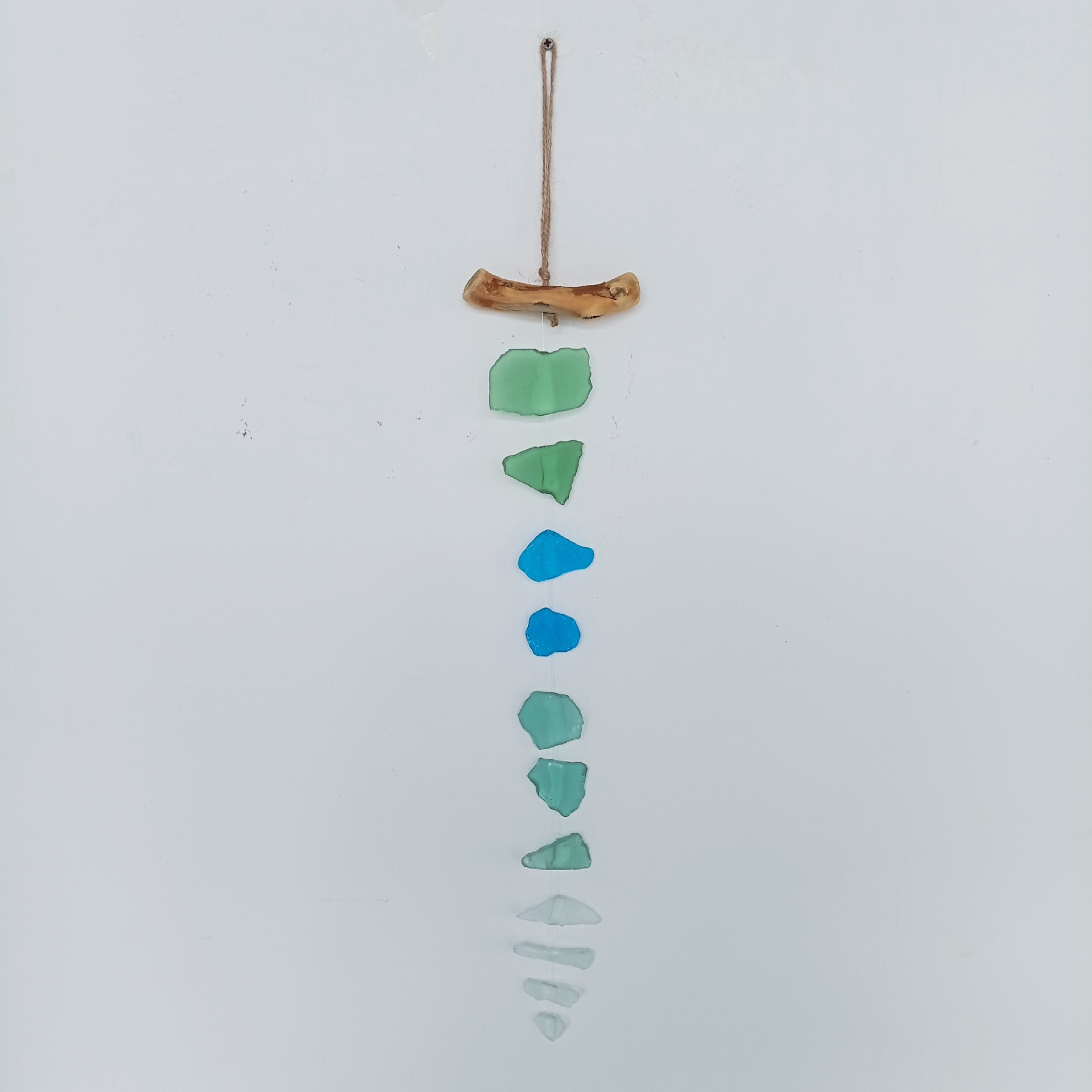 en drijfhout, gezandstraald Boheems zeeglas, handgemaakte windgong