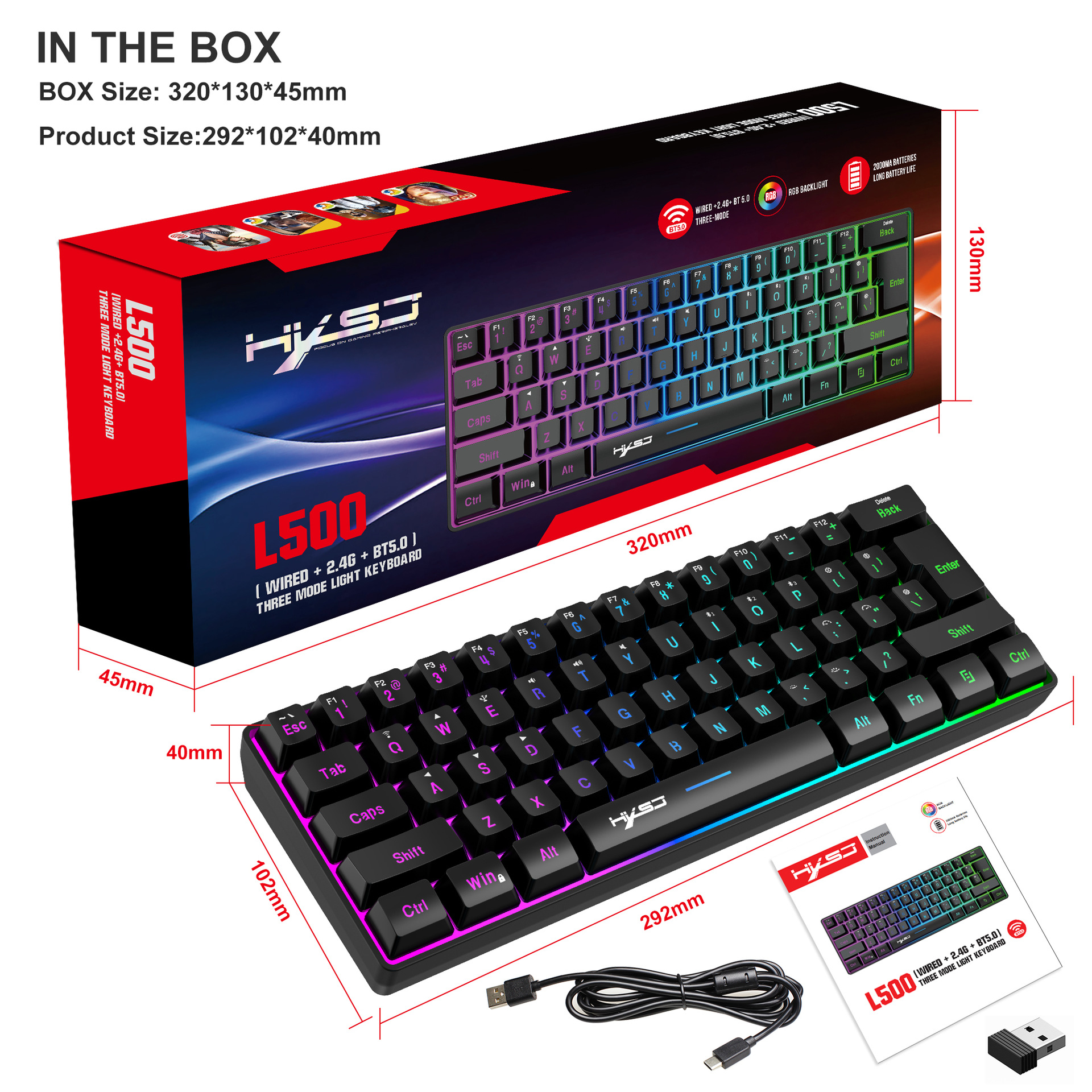 L500 het derde proefexamen compacte film RGB-achtergrondverlichting 2.4G/bluetooth/bedraad gametoetsenbord